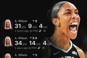 此役,阿贾-威尔逊在36分钟的时间里,投篮21中7,三分球2中0,罚球19中17,砍下31分9篮板4助攻2抢断3盖帽的数据。