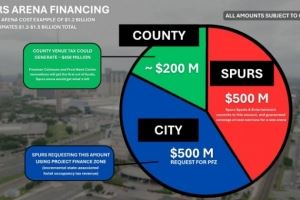 马刺队已承诺为该项目出资5亿美元,并保证承担任何超支费用。其他部分(预计)为县场馆税分配1.7亿、城市资金5亿。
